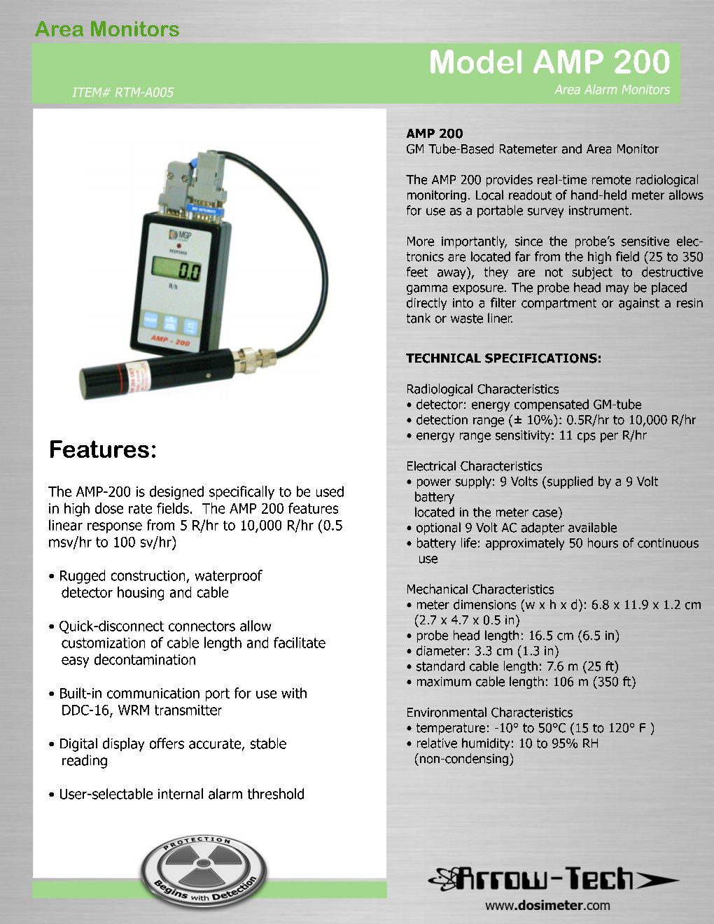The AMP-200 provides real-time remote radiological monitoring. Local readout of hand-held meter allows for use as a portable survey instrument.
