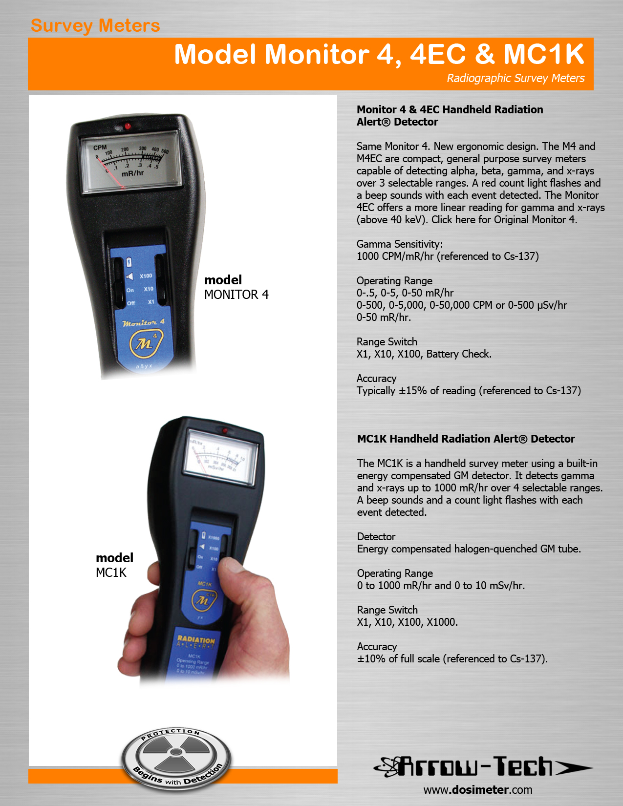 Same Monitor 4. New ergonomic design. The M4 and M4EC are compact, general purpose survey meters capable of detecting alpha, beta, gamma, and x-rays over 3 selectable ranges. A red count light flashes and a beep sounds with each event detected. The Monitor 4EC offers a more linear reading for gamma and x-rays (above 40 keV).